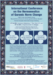 The international conference on “Hermeneutics of Quranic Norm Change” organized by the longterm project “Normativität des Korans” (principal investigators: Mohammed Nekroumi, Fahimah Ulfat, Mouez Khalfaoui) takes place on October 14th-15th in Erlangen, amongst others with Asma Barlas. Please register due to limited number of persons.