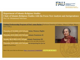 The Chair of Islamic-Religious Studies with the Focus Text Analysis and Jurisprudence of Prof. Mohammed Nekroumi warmly welcomes the renowned researcher Prof. Asma Barlas from the Ithaca College, Ithaca New York as part of a visiting professorship at the Department of Islamic Religious Studies at the Friedrich-Alexander University in Erlangen.